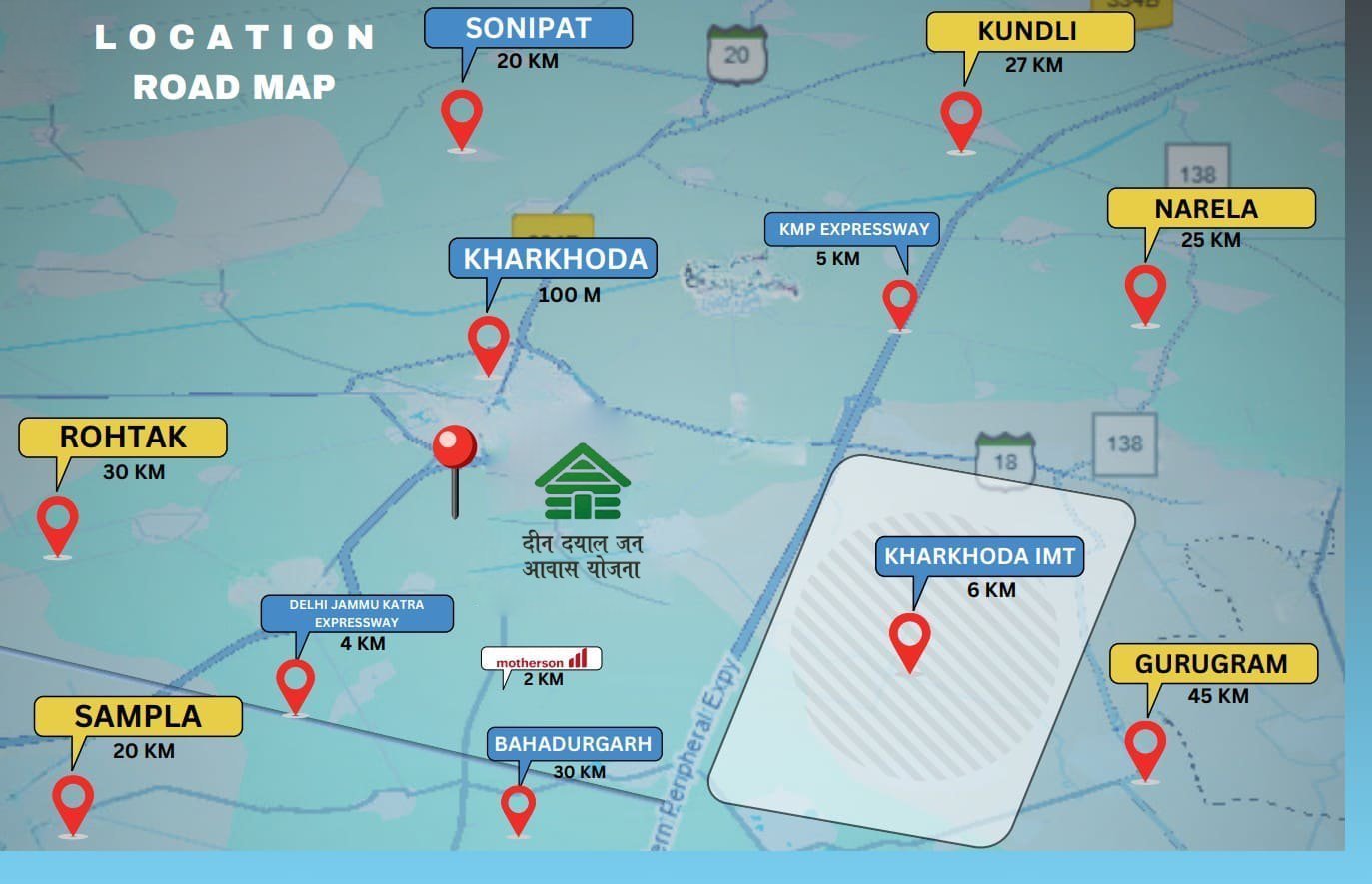 Deen Dayal Jan Awas Yojna (DDJAY) plots in Kharkhoda are premium residential opportunities offered under the Haryana Government’s affordable housing initiative. Strategically located near major highways and essential amenities, these plots promise a well-connected and thoughtfully developed living environment for families seeking quality homes at accessible prices.